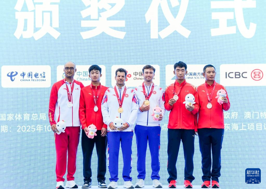10月29日,香港队冠军贝俊龙(右三)、亚军山西队选手唐元怀(左二)、季军江苏队选手罗俊锁(右二)在ELKA 7级颁奖典礼上与教练合影。当日,第十五届全运会帆船比赛第二阶段比赛在广东省汕尾市继续进行。新华社记者晋美多杰 摄