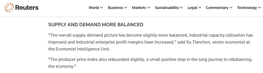 报道援引经济学人智库高级经济学家的话说,中国目前的供需格局已经趋于平衡,工业产能利用率有所提高,企业利润率也有所改善。此外,工厂工业品价格指数回升。 “虽然这只是经济再平衡漫长道路上的一小步,但这也是一个积极的信号。”